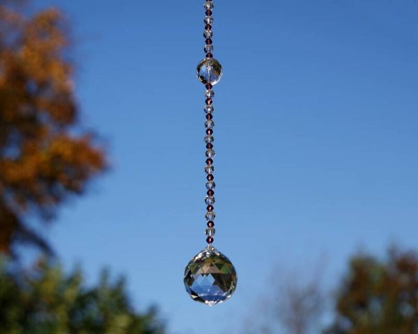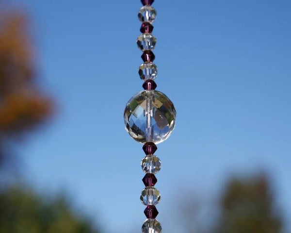 Clear and Purple Crystal Suncatcher, made from clear and purple crystal beads and a 30mmclear crystal ball prism.
