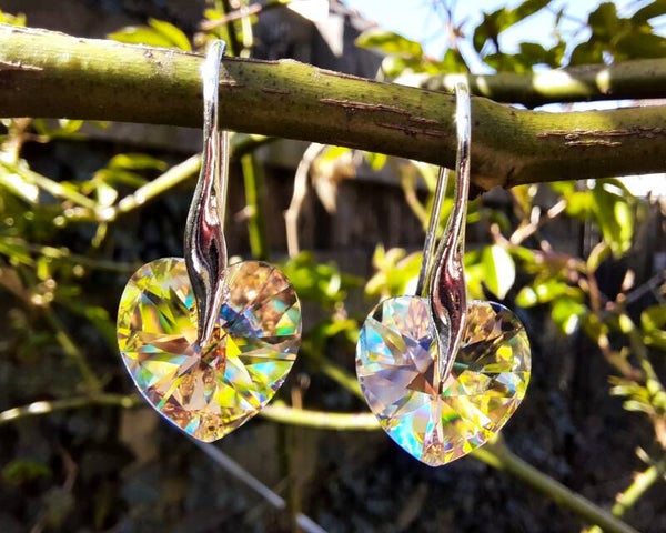 The Crystal AB Swarovski element crystals are clear with an AB (Aurora Borealis) coating that gives the crystals a primarily golden and blue sparkle. This iridescent coating changes the colour as the crystal moves, so the exact colour depends on the light shining on them. The hearts are foil backed and pointed, which creates incredible reflective intensity and makes the crystals sparkle and shine even more.