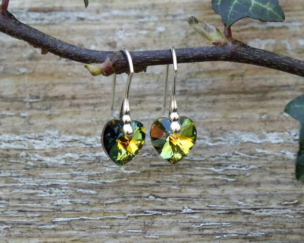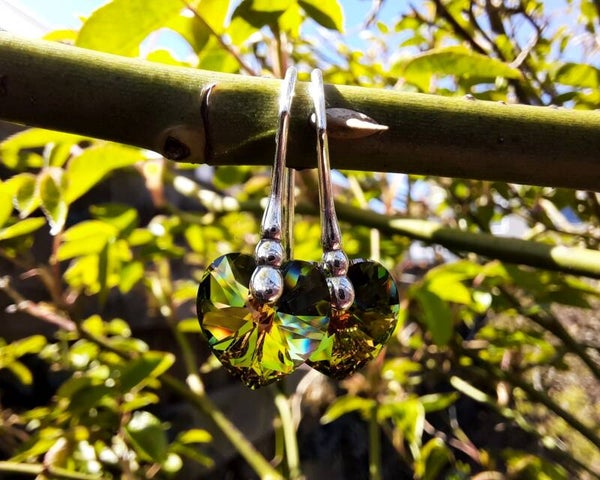 The Crystal Sahara Swarovski element crystals are a blend of green/ amber with a hue of rusty red/golden and blue colours, depending on the light shining on them. The faceted hearts are foil backed and pointed, which creates incredible reflective intensity en makes the crystals sparkle and shine even more.